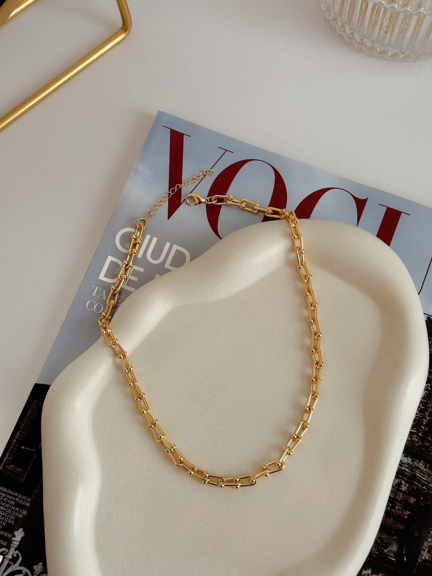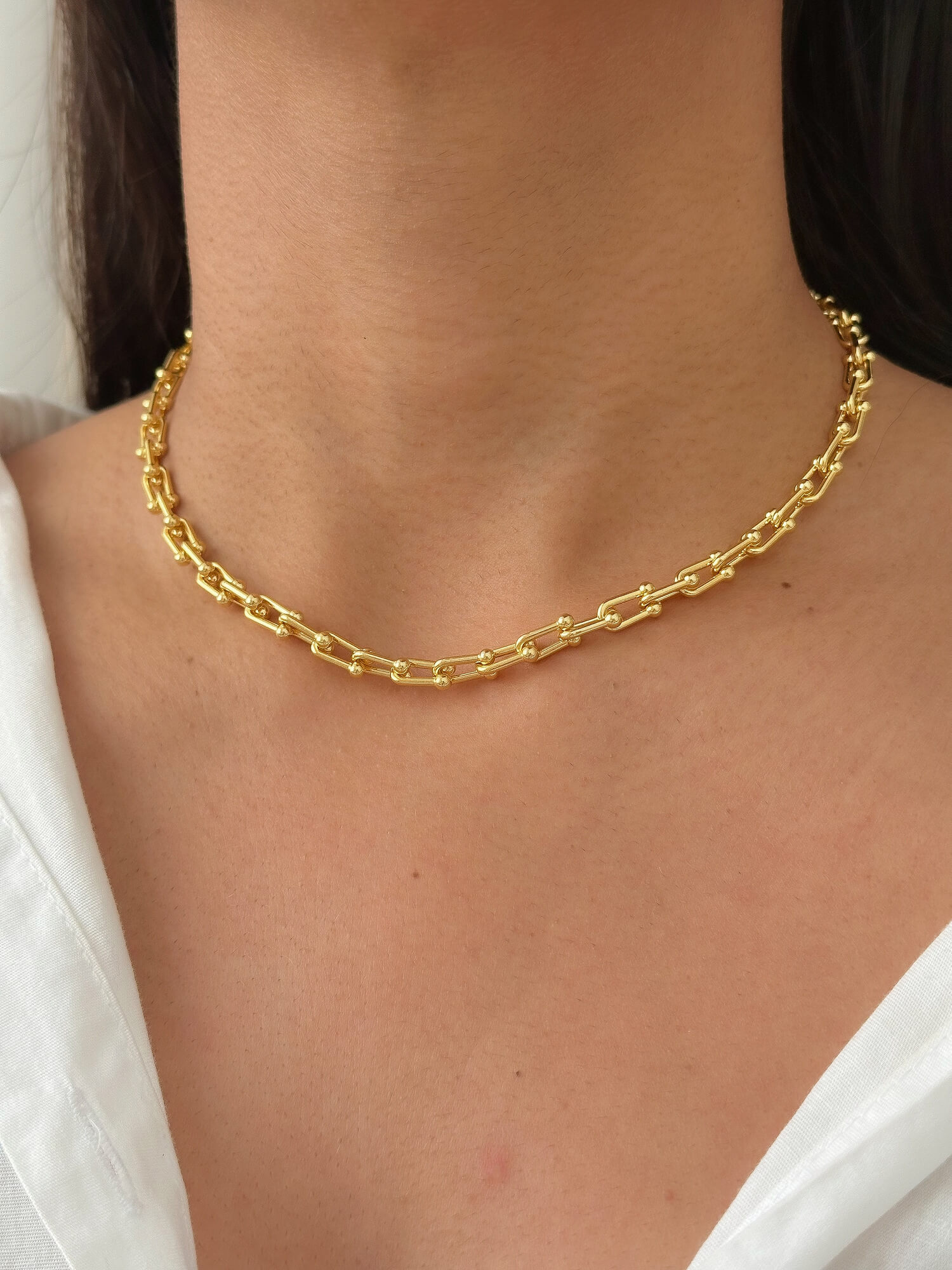 Cadena de eslabones escalonados en material baño en rodio. Su medida es de 38cm + 4cm de extensión.